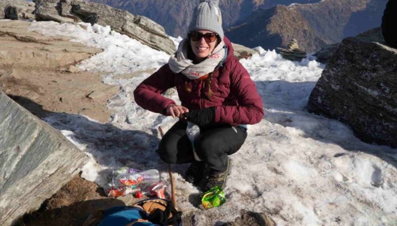 स्पेन की जेमा अपनी पीठ पर हिमालय का कचरा ढो रहीं हैं। वह वर्ष 2023 में योग सीखने व पहाड़ घूमने आईं थी, लेकिन यहां कूड़ा देखकर हैरान रह गई।